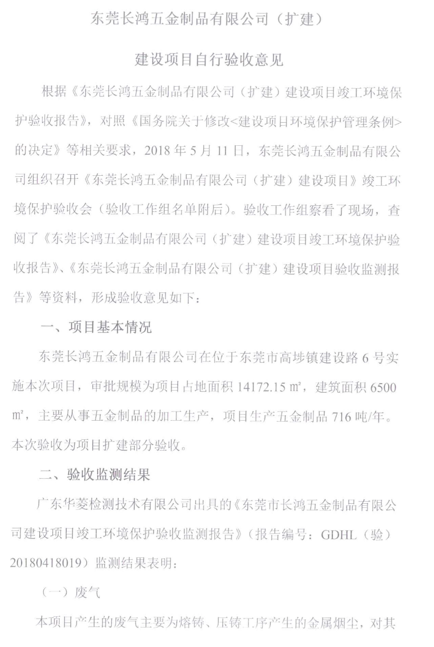 東莞長鴻五金制品有限公司(擴建)建設(shè)項目自行驗收意見_工業(yè)廢水處理_一體化污水處理設(shè)備_廢水處理工程_環(huán)境檢測公司 版權(quán)所有