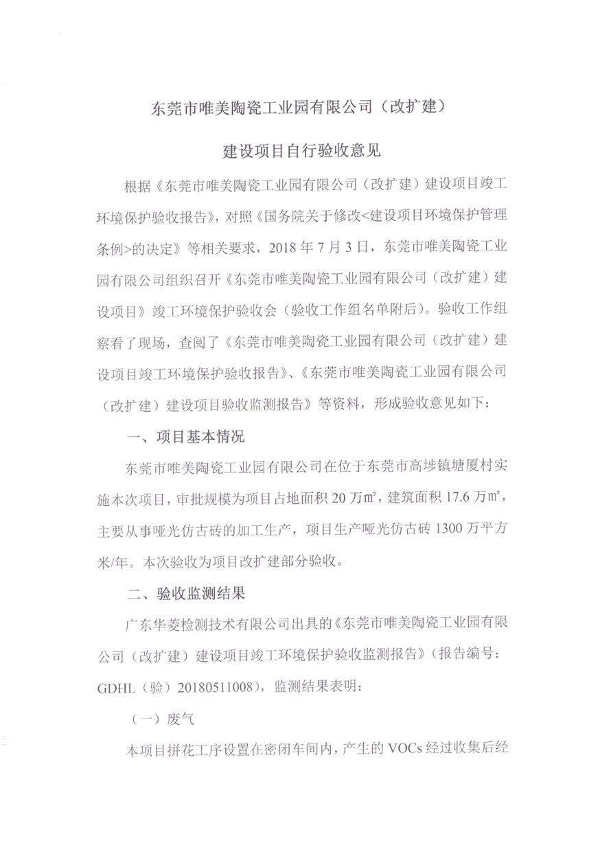 東莞市唯美陶瓷工業(yè)園有限公司(改擴(kuò)建)建設(shè)項(xiàng)目自行驗(yàn)收意見(jiàn)_工業(yè)廢水處理_一體化污水處理設(shè)備_廢水處理工程_環(huán)境檢測(cè)公司 版權(quán)所有