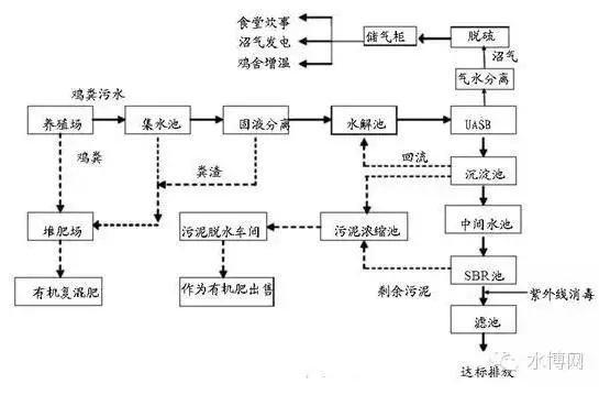 雞場采用清潔生產(chǎn)工藝,每天排放的雞糞人工清除至干雞糞池,堆漚發(fā)酵后作為農(nóng)田有機肥。每天處理排放的沖洗污水由污水溝匯集于集水池中,經(jīng)過機械格柵初步固液分離后,再經(jīng)氣浮,分離出的糞渣并入收集的干糞中,作有機肥料;經(jīng)氣浮處理后的污水中SS大大降低、同時起到一定的脫氮作用。污水進入水解池,在水解池,兼性微生物將復雜的有機物降解為簡單有機物,水解池同時可調(diào)節(jié)水量,使后續(xù)生化處理單元的水量穩(wěn)定。經(jīng)水解處理后的污水再泵入UASB反應器進一步厭氧處理。厭氧池出水自流進入沉淀池。沉淀出水進入中間水池,一部分用作液態(tài)肥料澆灌菜地,一部分進入SBR池進行進一步處理,SBR池出水經(jīng)過紫外線消毒和自然氧化塘處理后達標排放。沉淀水解池、厭氧池、厭氧沉淀池和SBR池產(chǎn)生的污泥進入污泥濃縮池濃縮后,進入貯泥池暫時貯存,濃縮后污泥經(jīng)過板框壓濾機脫水后并入收集的干糞中,作有機肥料。