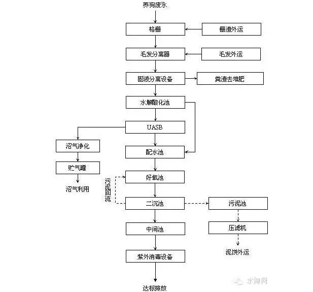 養(yǎng)殖場中的污染主要由糞(以固體為主)和沖洗養(yǎng)殖場形成的污水(包括殘留尿液)兩個(gè)方面組成。對糞便的處理不外乎干清糞和水沖糞兩種,糞便進(jìn)行固液分離后,排往污水處理系統(tǒng)。這些廢水中含有大量的有機(jī)物、氨氮、總磷、SS以及致病菌,狗在脫毛期還會產(chǎn)生大量的毛發(fā),如不加治理,會產(chǎn)生令人惡心的惡臭、對環(huán)境質(zhì)量造成極大影響,深受環(huán)保的重視,急需治理。