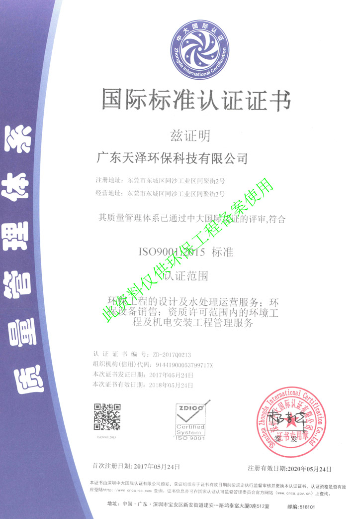 質(zhì)量管理體系國際標準認證證書_工業(yè)廢水處理_一體化污水處理設備_廢水處理工程_環(huán)境檢測公司 版權所有